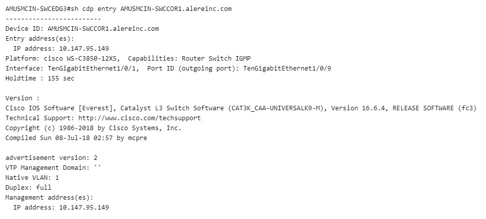Display information about a specific CDP neighbor (or all neighbors by using *):