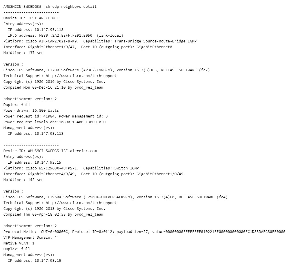 show cdp neighbors [detail] The detail keyword is similar to show cdp entry and displays more information about the CDP neighbors