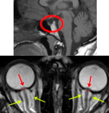 Sela túrcica vazia, distensão do espaço subaracnóideo peri-óptico, protusão das papilas do nervo óptico no vítreo, achatamento da esclera posterior
