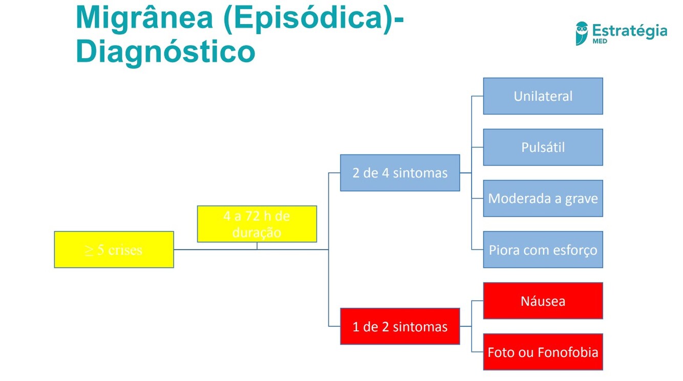Dor unilateral,pulsátil de moderada a forte intensidade,associada a foto e/ou fonofobia,náusea e/ou vômitos e piora com esforço