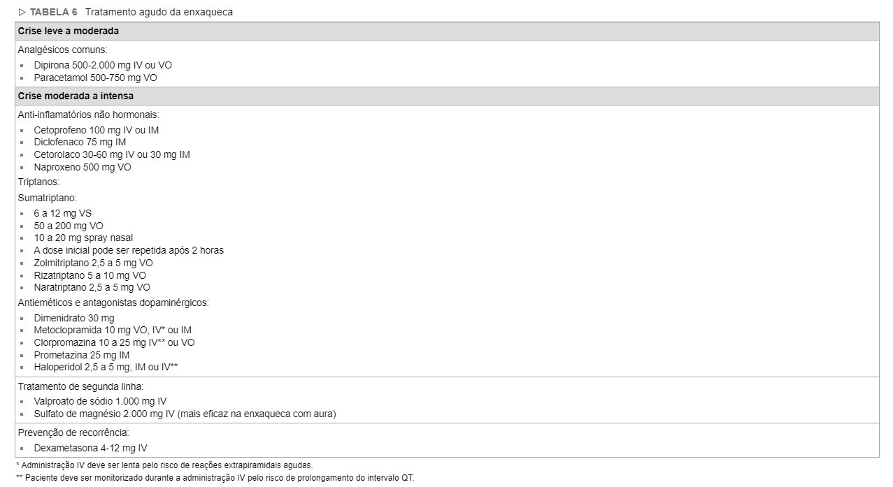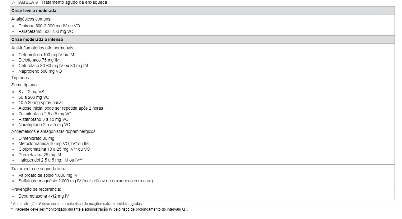 As classes de medicações disponíveis, alem dos triptanos(medicações específicas para o tratamento da crise aguda de enxaqueca,contraindicados na presença de doença arterial prévia ou HAS mal controlada) , são os analgésicos comuns(dipirona e paracetamol) , os antinflamatórios não hormonais (cetoprofeno,diclofenaco,ibuprofeno,naproxeno,cetorolaco), os bloqueadores dopaminérgicos (metoclopramida,clorpromazina), os anticonvulsivantes (valproato de sódio ) e em segunda linha o sulfato de magnésio