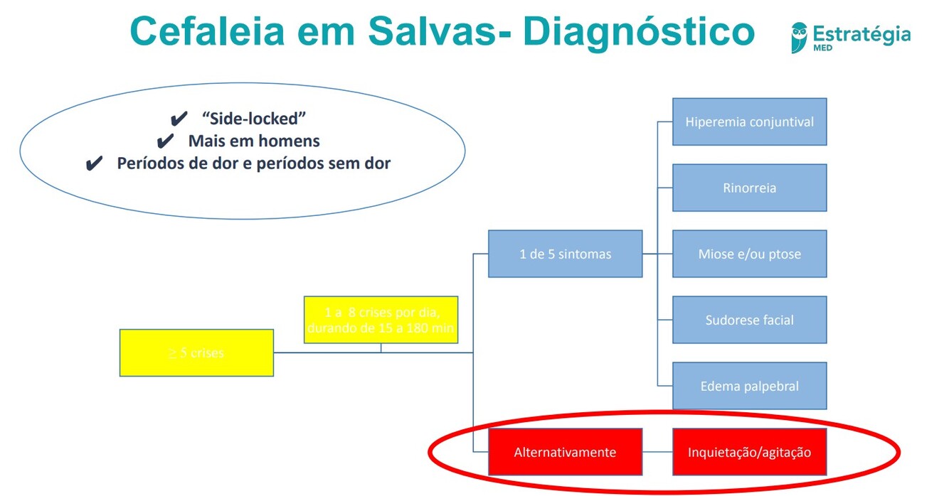 Entre as cefaleias trigêmino-autonômicas, a cefaleia em salvas é a mais frequente. Predomina na população do sexo masculino e tem pico de incidência entre a terceira e a quinta décadas. A apresentação clínica **é de cefaleia de forte intensidade, unilateral, acometendo região periorbitária e temporal, acompanhada de sintomas autonômicos ipsilaterais (hiperemia conjuntival, lacrimejamento e ptose, congestão nasal unilateral e rubor facial) e sensação de agitação ou inquietação durante a crise. **A duração de cada episódio é curta (entre 15 e 180 minutos) e os surtos duram entre 1 e 3 meses na forma episódica, com frequência de um episódio a cada 2 dias até oito por dia.
