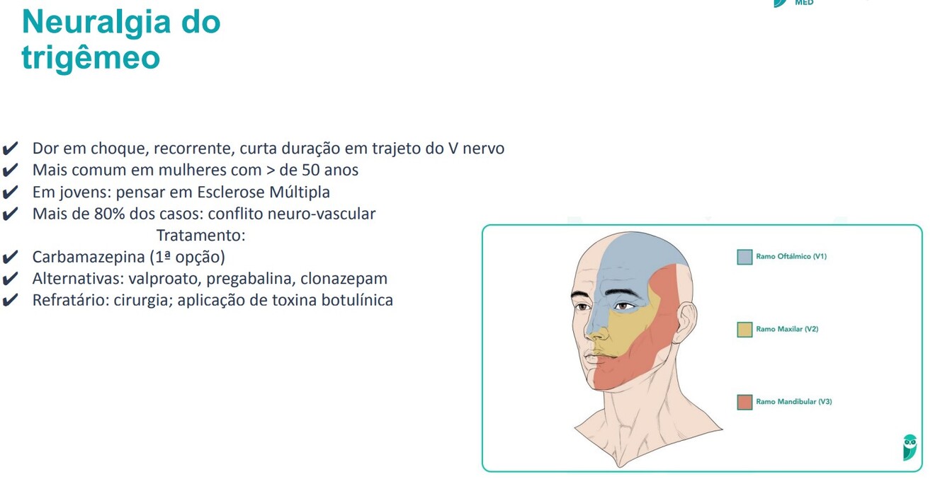 A neuralgia craniana mais comum é a do trigêmeo, que geralmente acomete o território de V3 e/ou V2, raramente sendo bilateral ou acometendo V1.**