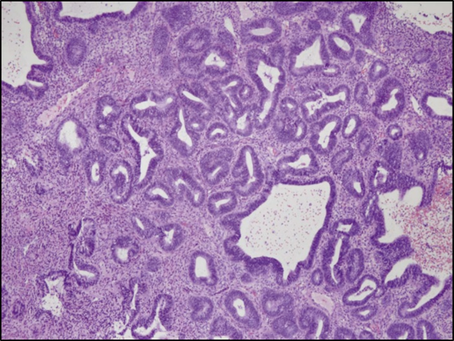 Microscopy- increased proliferation of the endometrial glands relative to the stroma, resulting in an increased gland-to-stroma ratio