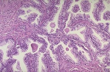 Papillary projection & columnar epithelial lining with scaloping edges.