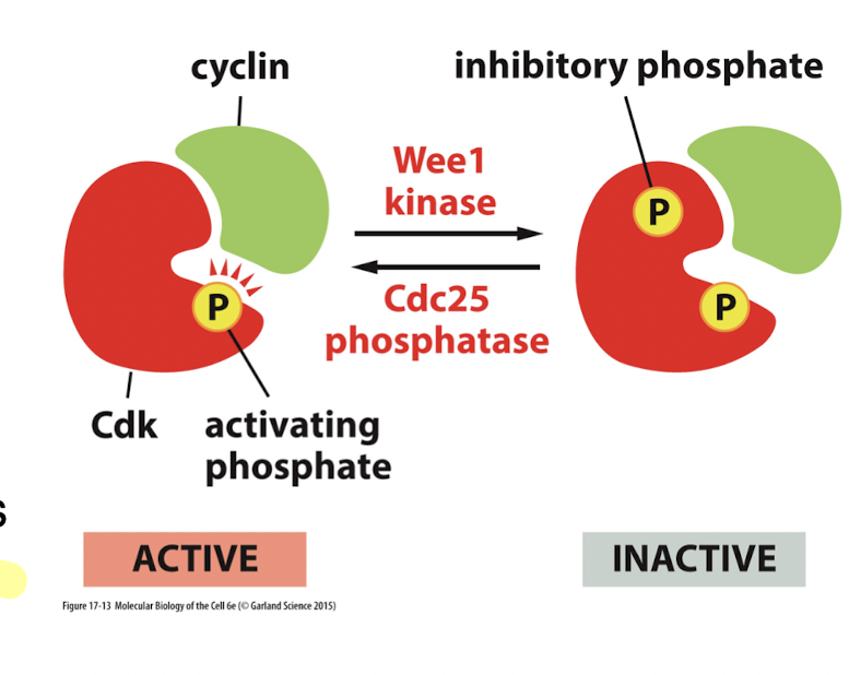 Phosphorylation of CDK at the active site inhibits CDK activity. Dephosphorylation by a phosphatase restores CDK activity.