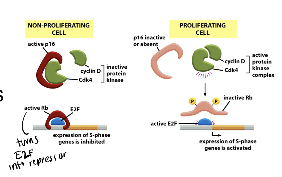 Rb binds and inhibits transcription factor E2F, which is needed to transcribe genes for S- and G1-CDKs. When a cell is stimulated by mitogens, Rb is phosphorylated and inactivated.