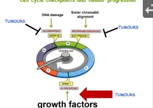 growth factors affect G1 checkpoint, allowing S phase to occur- tumour affect this tumours also effect G2 checkpoint (for DNA damage) or metaphase checkpoint (for alignment)