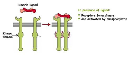 dimeric ligand binds to a monomeric receptor, forming dimers, as the 2 kinase domains brought together and are phospohrylated receptor protein tyrosine kinase involved, activating the receptor