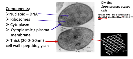 components: Nucleoid (DNA), ribosomes, cytoplasm, cytoplasmic/plasma membrane, thick! (multiple layers) 20-80nm cell wall of peptidoglycan