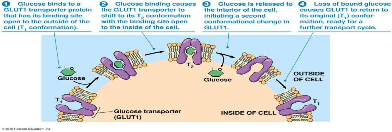 Describe the steps the protein takes to move glucose across the cell.