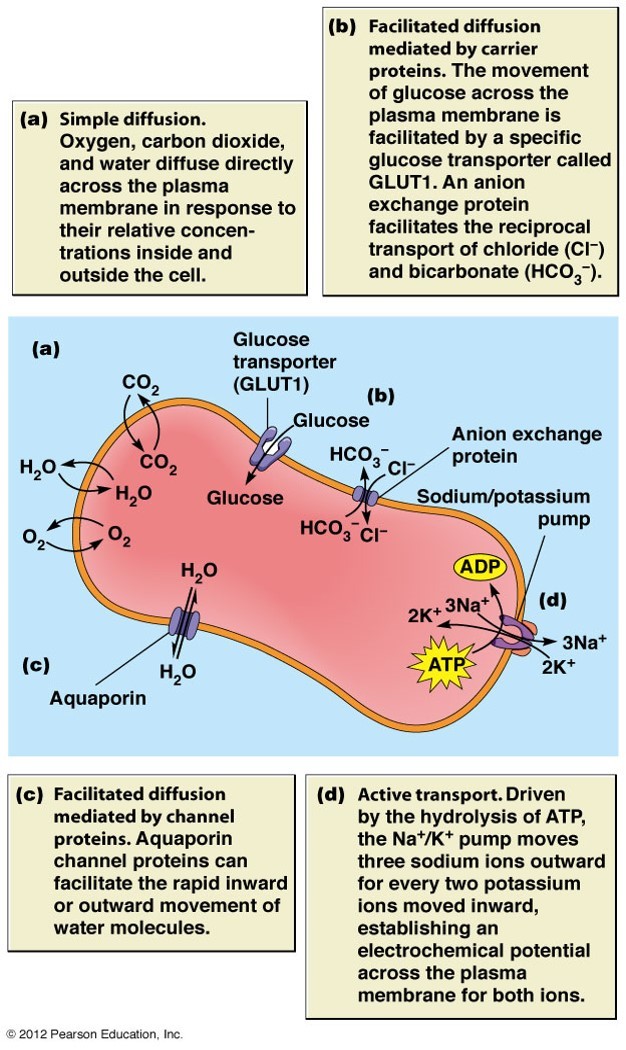 Tissues: CO2 diffuses into RBC and carbonic anhydrase turns it into bicarbonate ions. increase in bicarbonate concentration in cell moves it out of the cell