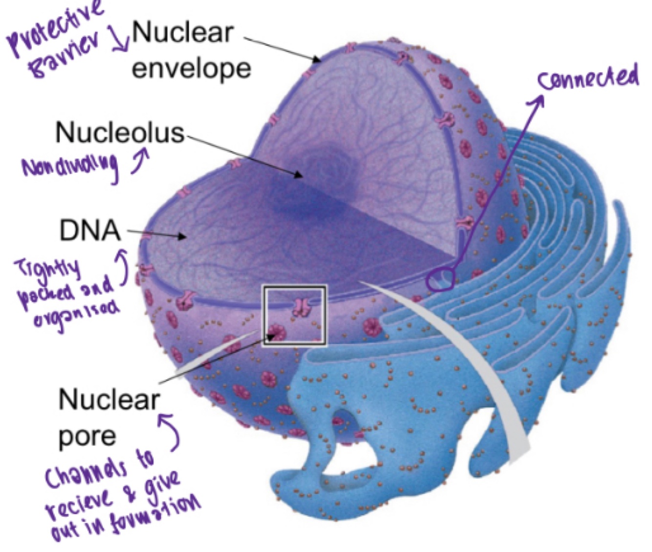 Surrounded by nuclear enveloped, has channels called nuclear pores, contains tightly packed DNA, prominent area called nucleolus