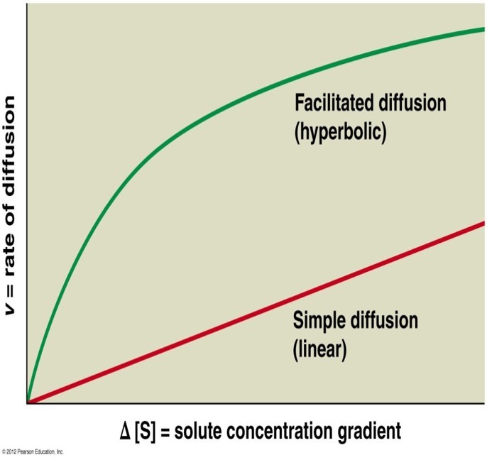 for facilitated diffusion the relationship between the rate of diffusion and solute concentration is linear when the concentration gradient is small, but when the concentration increases the diffusion rate is hyperbolic
