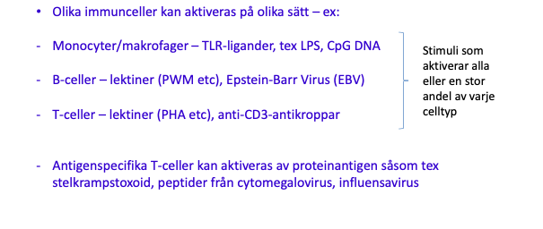 T-celler stimuleras med antigen eller substans som aktiverar många T-celler och celldelningen kan mätas mha inkorporering av radioaktivt tymidin i DNA.