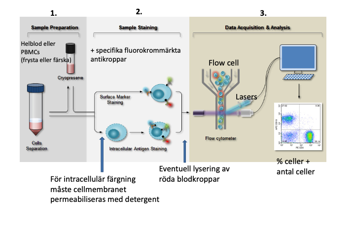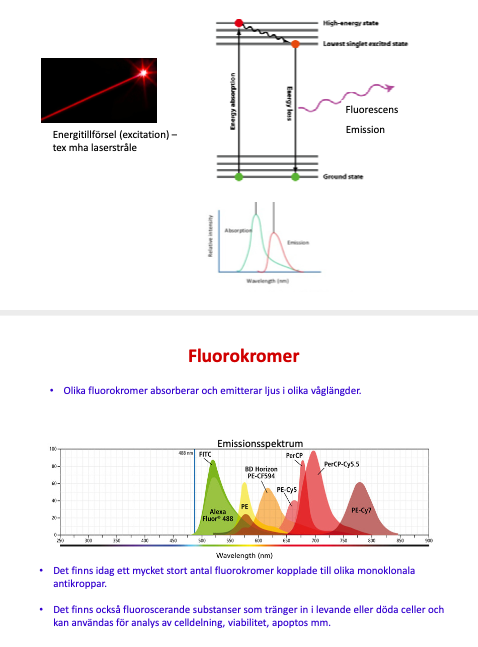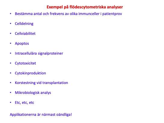 Funktion: Celler/partiklar analyseras baserat på ljusspridning och flouroscens. Ofta används flourokrom inmärkta antikroppar med specifika ytmolekyler för att skilja immuncellerna åt.