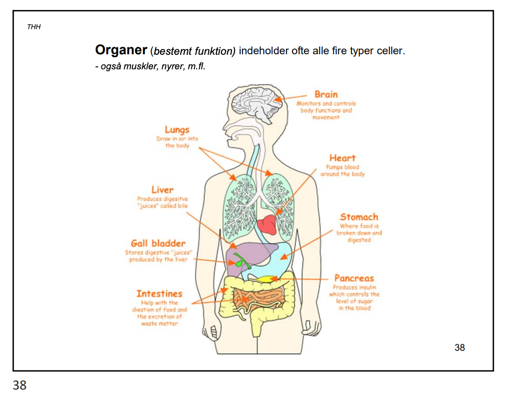Organ –> Indeholder oftest alle 4 typer af væv og er en samling af biologisk væv, som udfører en specialiseret funktion eller grupper af funktioner. fx lever, nyrer, hjerte, lunger, hjerne osv.