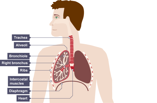The organs in the respiratory system are the lungs and trachea (windpipe)