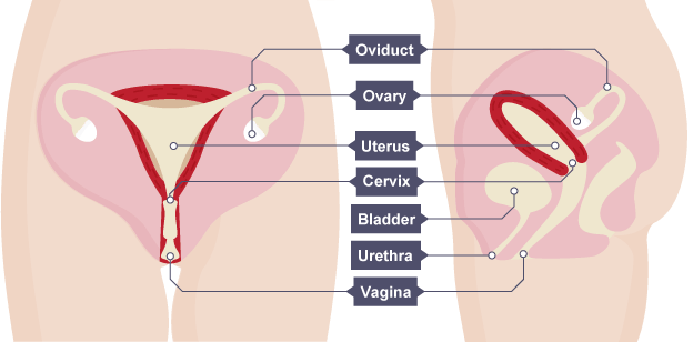 In women the main organs are the uterus (woumb), ovaries and the vagina