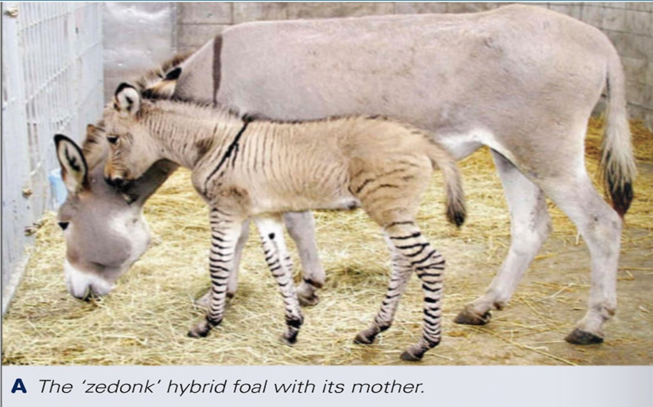 When 2 closely related species breed. The offspring of usually infertile but have characteristics of both parents e.g zedonk!