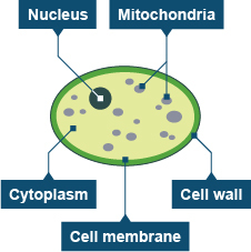A yeast cell has a nucleus (containing genetic material), cytoplasm, and a cell membrane, surrounded by a cell wall.