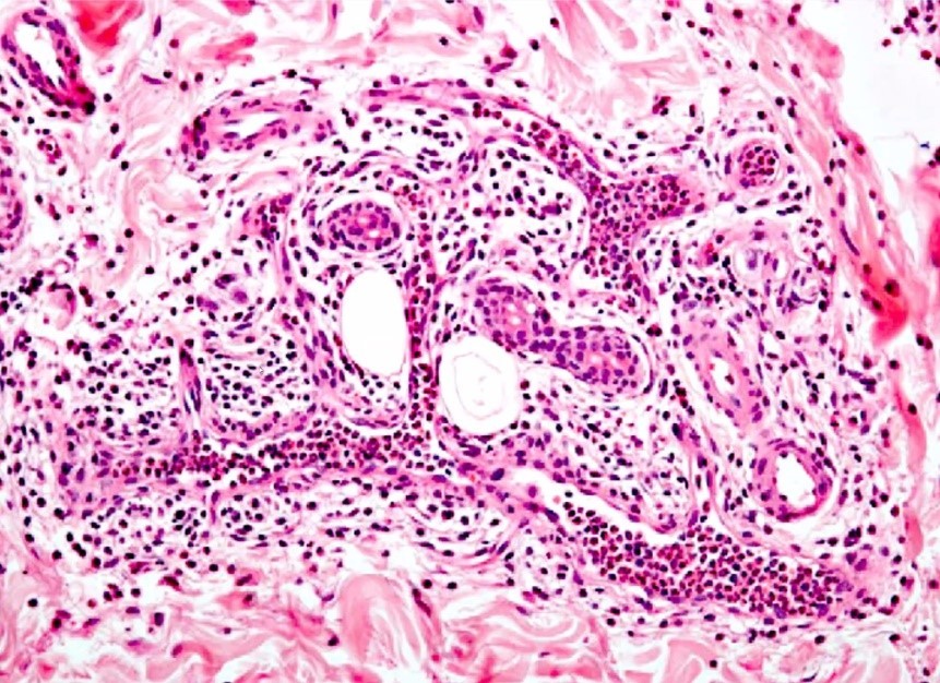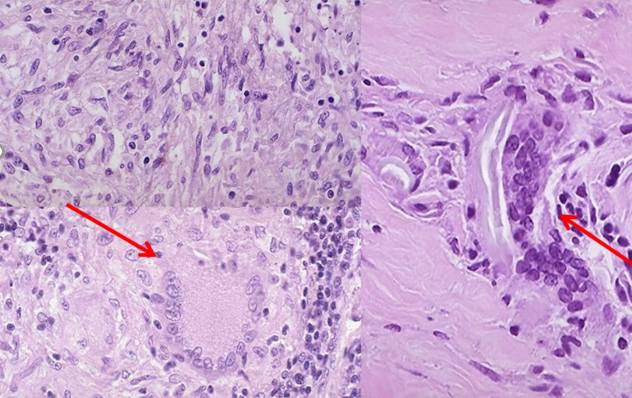 Här ses utvandrade vita blodkroppar (exodat)
