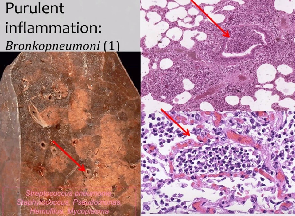 Högre förstoring visar polymorfa neutrolifer och makrofager i alvoelära lumen, i alveolär vägg syns också dilaterade kärl uppfullda bodkroppar (cellulär reaktion)