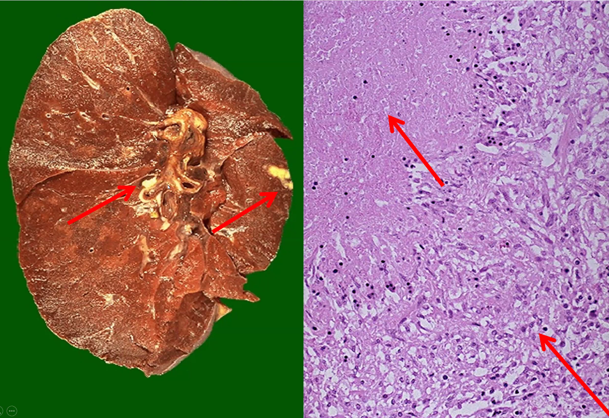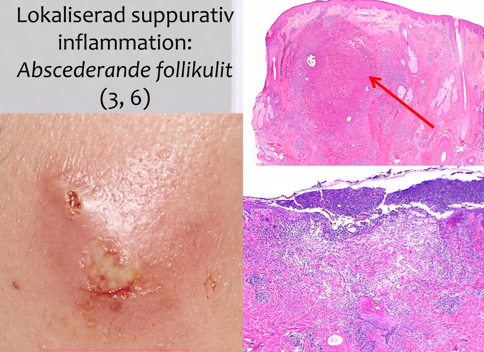 Övre röda pil visar döda nekros, väl avgränsad process (görs för att avgränsa inflammationen)