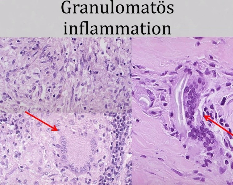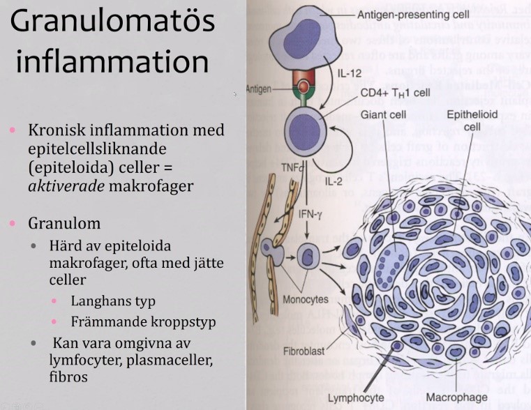 Granulomatös inflammation karakteriseras av förekomst av aktiverade makrofager, sk epiteloida celler, som ofta smälter ihop och bildar flerkärniga jätteceller.