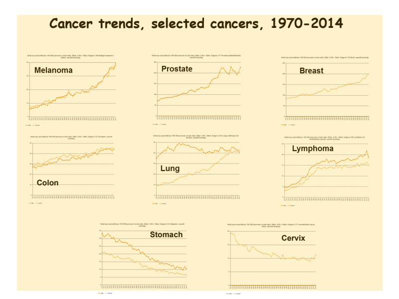 Nämn två cancerformer som har ökat kraftigt de senaste femtio åren, och varför. Nämn även två cancerformer som har minskat kraftigt de senaste femtio åren, och varför.