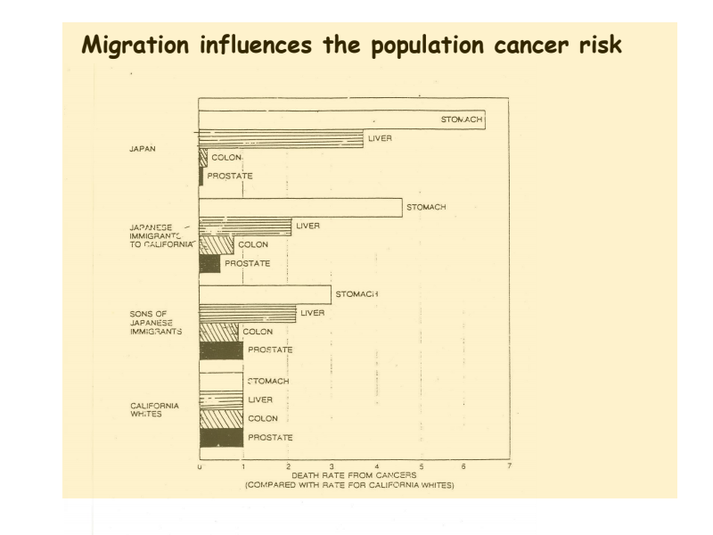 Vid migration till Kalifornien så ser man att dessa extremheter minskar, och rör sig mer åt hållet av de vita männen i Kalifornien. Kollar man på sönerna till de japanska immigranterna så har skillnaderna närmast utraderats för kolon- och prostatacancer, även om det fortfarande finns en viss förhöjd nivå av magsäcks- och levercancer. Det kan förklara med genetisk predisposition, alternativt att vissa kulturella vanor (till exempel konsumtion av viss mat) fortfarande består.