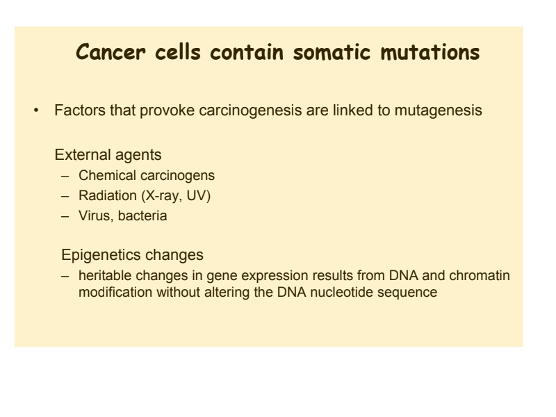 Externa carcinogener är ämnen som finns i miljön och som vi exponeras för. Exempel på detta är kemiska carcinogener, UV-strålning samt bakterier och virus. Det kan även förekomma epigenetiska förändringar.