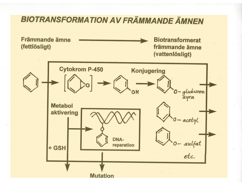 Främmande (fettlösliga) ämnen, som cigarettsröksmolekyler eller bensen, tas in i cellen där de känns igen av enzymer. Dessa enzymer försöker omvandla det till ett vattenlösligt ämne. Bensen hydroxyleras till fenol (hydroxibensen), och konjugering sker därefter så att den kan utsöndras.