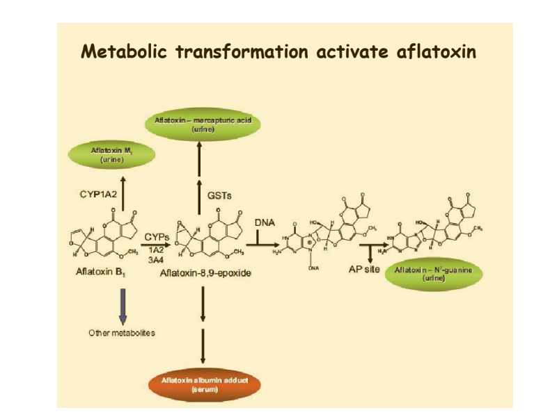 Aflatoxin är ett cancerframkallande gift som bildas i mögelsvampar. Det metaboliseras av CYP1A2 och CYP4A5 genom en oxidation, vilket resulterar i reaktiva epoxider.