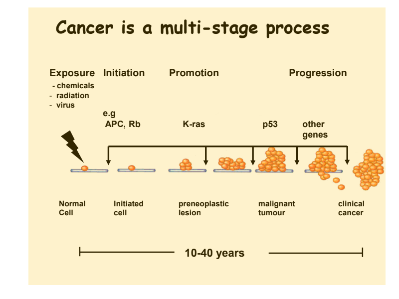 Förklara, i övergripande drag, hur cancer uppstår. Från vad som initialt påverkar den normala cellen, till att det upptäcks i kliniken. Hur lång tid tar en sådan här process vanligtvis?