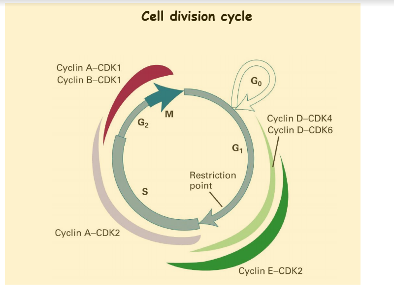 Under G1 så får cellen signaler om celldelning, vilket gör att cyklin D och CDK4/6 bildar ett komplex med kinasfunktion. Detta leder en fosforylering av retinoblastomproteinet, som ej längre kan hålla E2F.