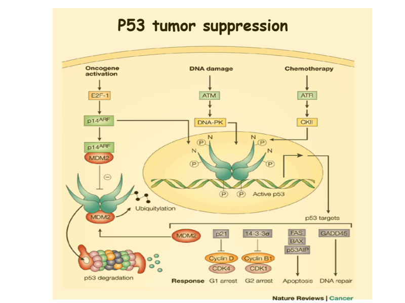I samband med onkgensaktivering, DNA-skada och kemoterapi så kommer p53 att fosforyleras, vilket gör så att den kan bilda en tetramer och agera som transkriptionsfaktor.