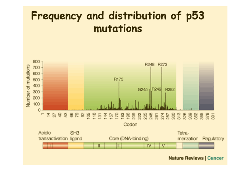 Mutationen i genen som kodar för p53 är spridda över 200 aminosyror, och de flesta påverkar kontaktytan som p53 har med arvsmassan.