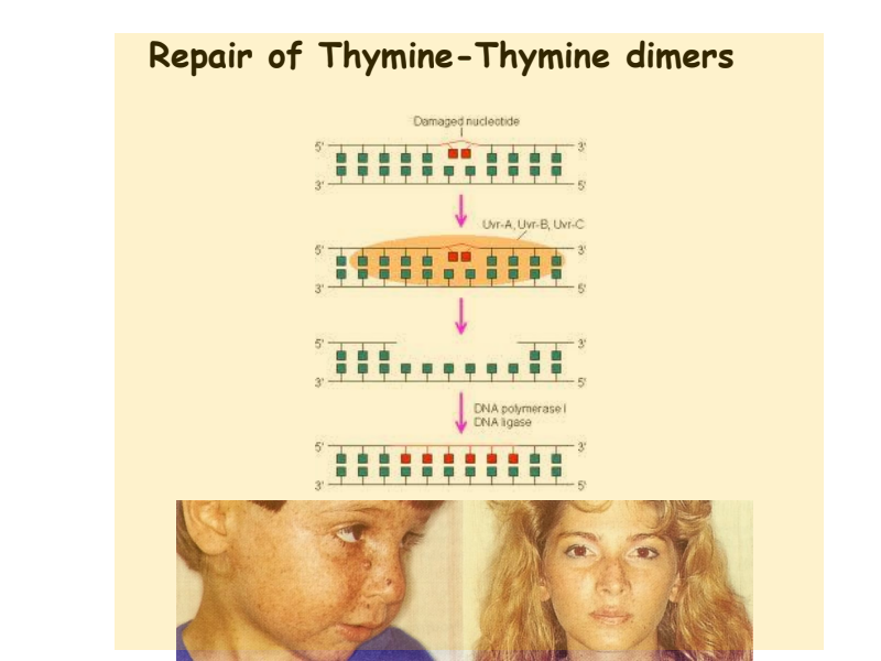 UV-strålning skapar fotoprodukter, varav en av dem är tymin-tymin-dimers. Det innebär att tymin, istället för att binda med en vätebindning till sitt naturliga baspar cytosin, istället binder kovalent till tymin bredvid.