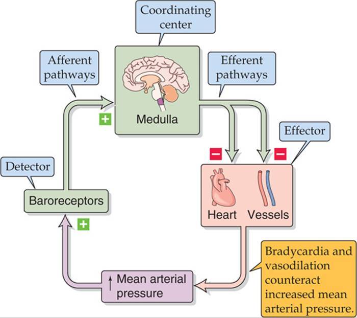 Arterial BP gets too HIGH: Stretch receptors/barorecetpors are stimulated, sending an afferent singal to the medulla which inhibits the vasomotor center–>decreased pumping and dilation of blood vessels to lower the blood pressure.