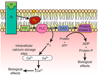 Causes PIP 2 to be cleaved by PLC to make IP3 and DAG . IP3 stimulates calcium release from the SR. DAG actives PKC.