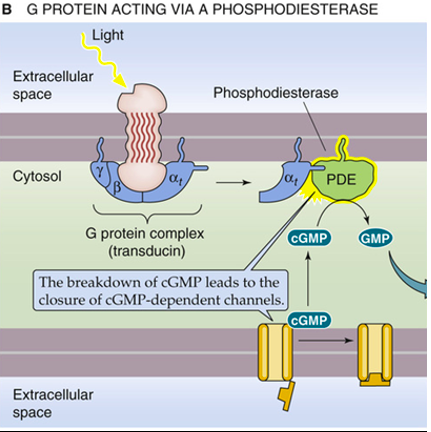 G-protein acting via a Phosphodiesterase (PDE)–>reduction in cGMP–>GMP.