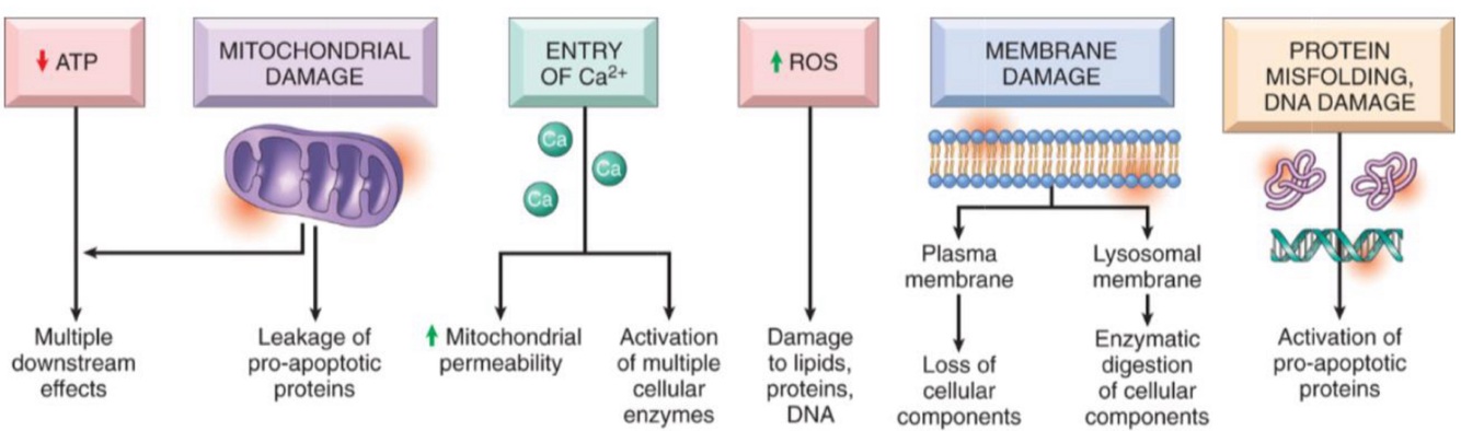 things that occur in cells secondary to cause of damage/stimuli:
