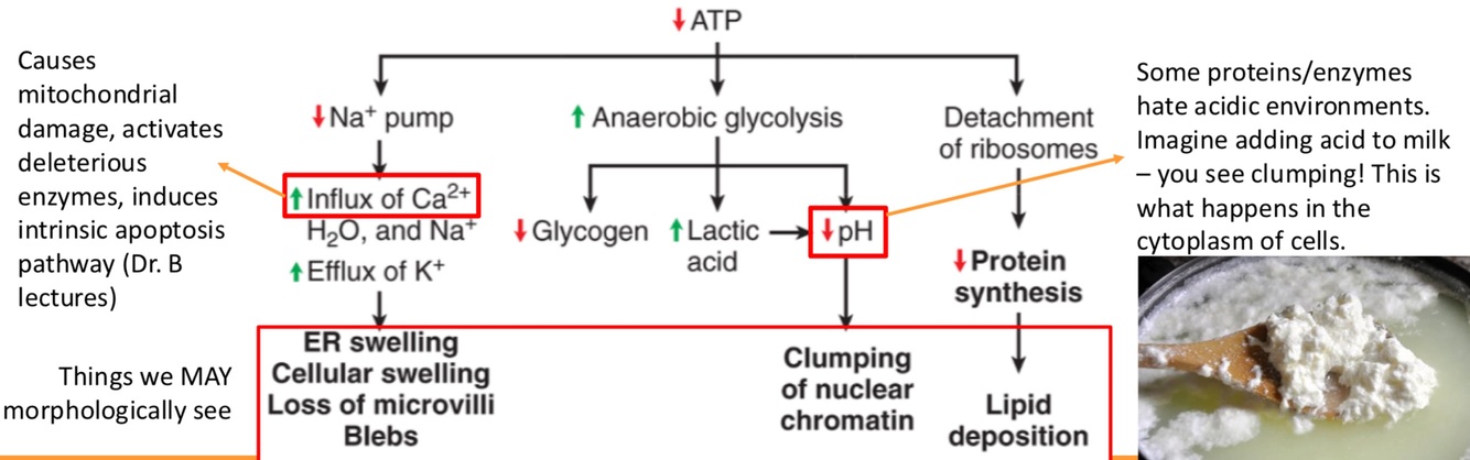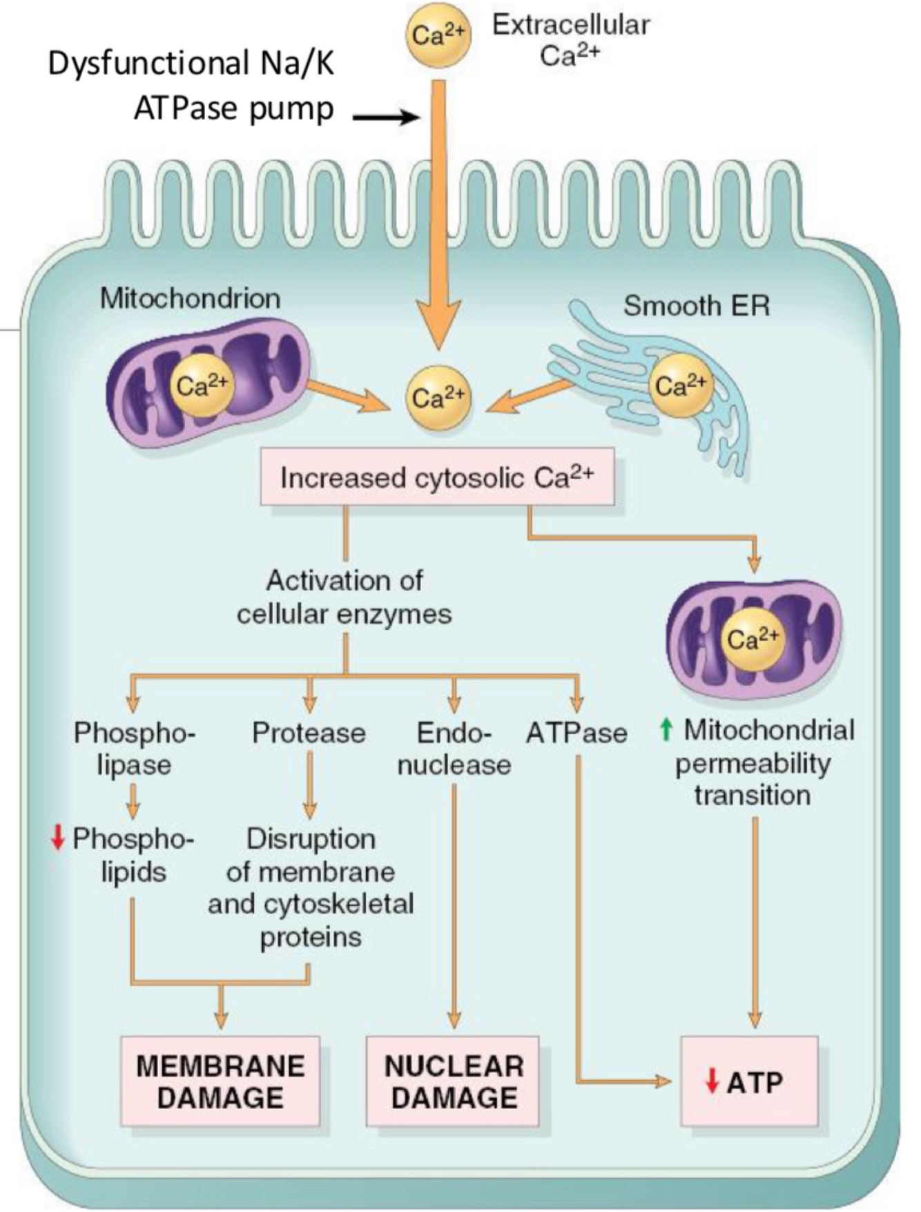 - activiation of numerous enzymes resulting in membrane + nuclear damage as well as further depletion of ATP