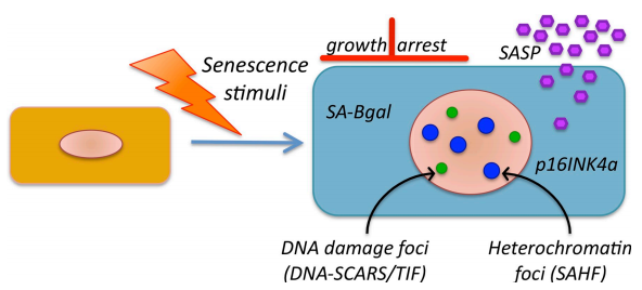 The presence of permanent cell cycle arrest, acquisition of major morphological change, expression of SA-b-GAL, accumulation of SAHFs and SDFs, acquisition of SASPs, mitochondrial dysfunction and increased ROS production and autophagy in a senescent cell are collectively known as the ‘cellular senescence signature’.