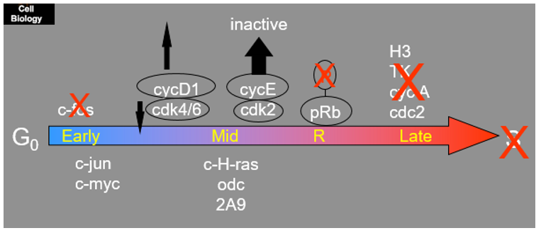 The transition from low serum induced sleep state (quiescence) to re-stimulation of division (entering S-phase) spikes production of a number of transcriptional activator genes. These can be expressed at different times: early, mid, restriction point (R), and late. In a normal proliferating cell, certain factors are present during the transition from G0 to S phase, whereas in senescent cells there are differences (crosses and arrows mark this in image). Phosphorylation of pRb does not happen, so any genes down the road from that cannot be expressed.