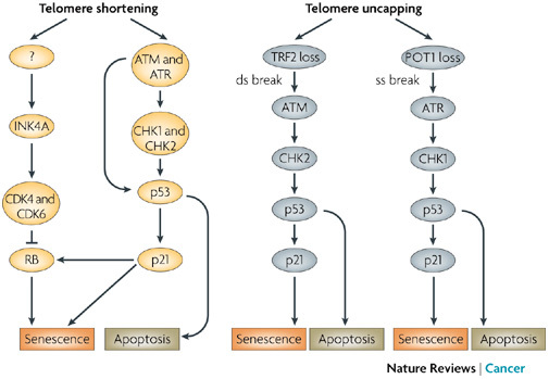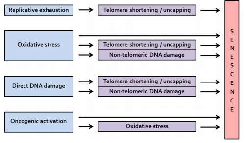 Senescence is activated once a cell has suffered a critical level of damage, regardless of the nature of the trigger. A cell may be subjected to multiple stresses, which can exert a cumulative effect on the cell. For example, extrinsic factors such as oxidative stress impact on intrinsic factors such as accumulation of DNA damage and the rate at which telomeres shorten.