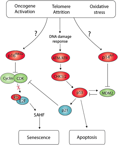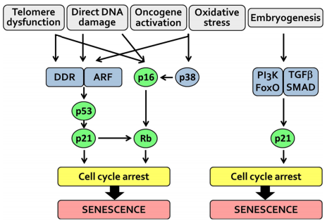 The senescence programme is activated once a cell has suffered a critical level of damage of any kind. Senescence is established and maintained by the p53 and p16- Rb tumour suppressor pathways. Both p53 and Rb pathways are activated in parallel and are able to induce cell cycle arrest independently; however, both interact at various levels and cross-regulate each other, making them a highly complex stress-signal integration and processing unit. Both, p53 and Rb are transcriptional regulators with upstream regulators and downstream effectors.