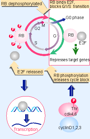 Rb, in its active hypo-phosphorylated form, binds to E2F proteins and represses their transcriptional activity and thereby inhibits cell cycle progression.