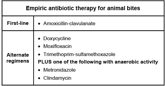 recommended for animal bite wound near lymphatics and blood vessels, on hand and close to joints or bones, AND IN IMMUNOCOMPROMISED PTS AND THOSE THAT NEED SURGERY.